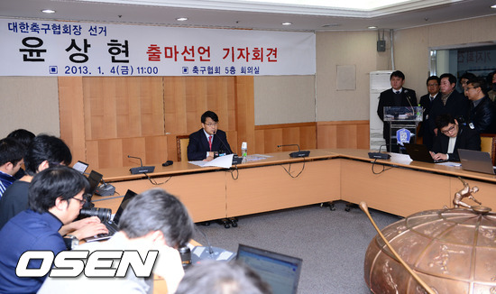 4일 오전 서울 종로구 신문로 대한축구협회 축구회관에서 열린 윤상현 국회의원(51, 새누리당·인천 남구을)의 제52대 대한축구협회장 선거에 공식 출마 선언 기자회견에서 윤상현 의원이 말을 하고 있다.