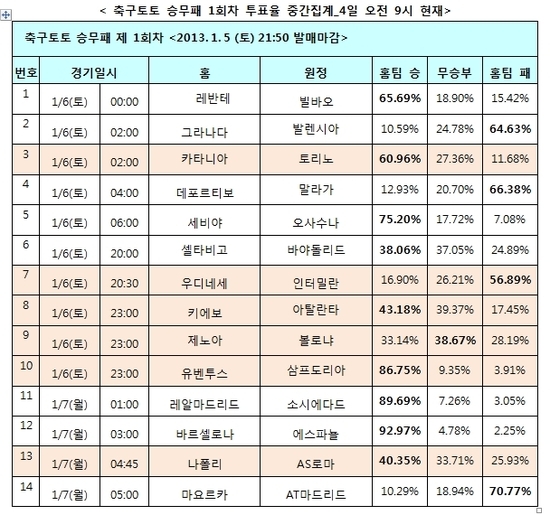 축구토토 승무패 1회차 투표율 중간집계 결과