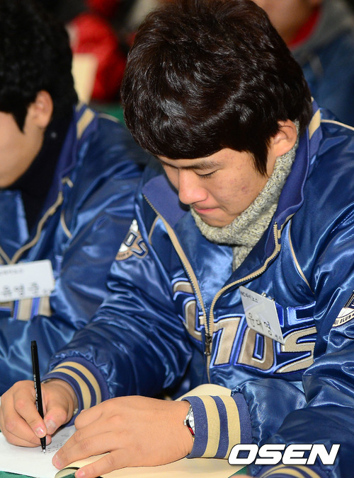 4일 오후 대전 유성구 리베라호텔에서 진행된 '2013 프로야구 신인선수교육'에서 NC 윤대영이 서울중앙지검 김재훈 부장검사의 강의를 필기하고 있다.