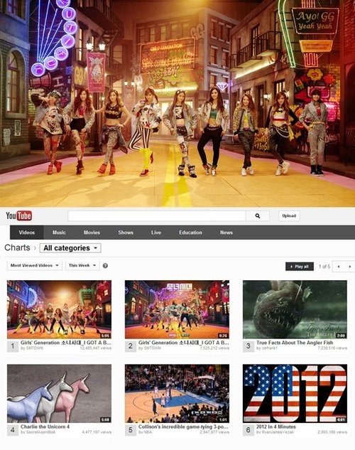 4일 유튜브의 전세계 가장 많이 본 동영상 주간 순위에 따르면 소녀시대의 신곡 '아이 갓 어 보이(I Got a Boy)'의 뮤직비디오가 1248만건 돌파로 1위, 선공개 곡 '댄싱퀸'의 댄스 버전이 752만건 돌파로 2위를 차지했다.