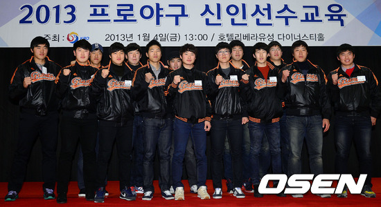 4일 오후 대전 유성구 리베라호텔에서 진행된 '2013 프로야구 신인선수교육'에서 롯데 송주은, 박진형, 송창현, 조홍석, 백민기, 구승민, 고도현, 이종화, 임종혁, 정준혁이 포토타임을 갖고 있다.