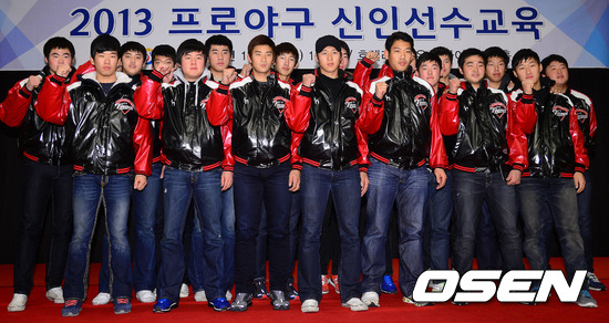 4일 오후 대전 유성구 리베라호텔에서 진행된 '2013 프로야구 신인선수교육'에서 LG 신인 선수들이 포토타임을 갖고 있다.