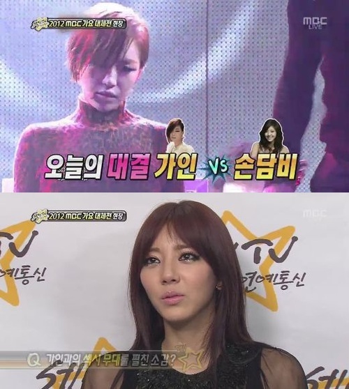 가인은 16일 오후 방송된 MBC '섹션TV 연예통신'에서 손담비와 2012 MBC 가요대제전에서 손담비와 섹시 대결을 펼친 것에 대한 소감을 털어놨다.