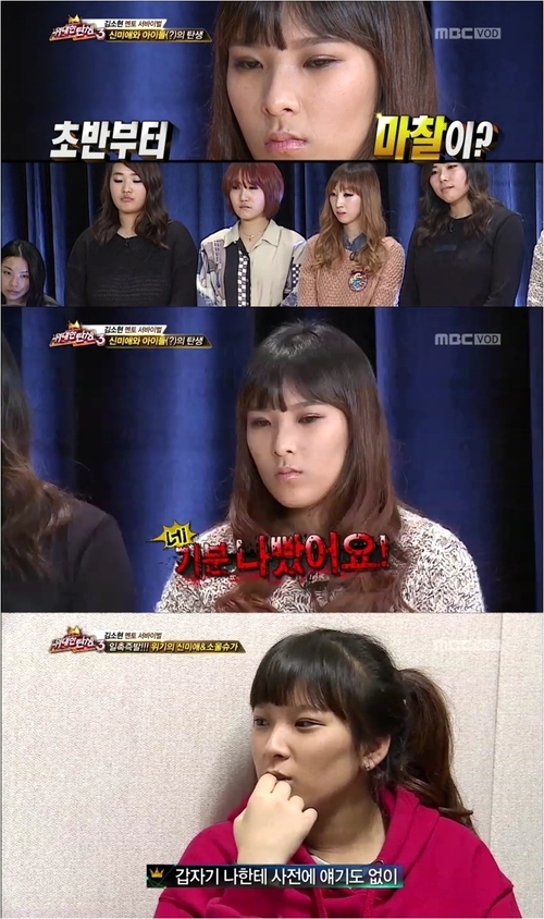 이들은 김소현 앞에서 중간점검을 받던 중 이예인이 신미애를 향해 “기분 나빴던 적이 있었다”고 말하면서 갈등이 표출됐다. 신미애는 “무대에서 그렇게 말하면 내가 이상한 애가 되지 않느냐”고 따져물었고 이예인은 “오늘 와서 (불만이) 터졌다. (너에게) 파트를 몰아줬는데 연습도 안하고 오면 어떡하냐”고 지적했다. 일촉즉발의 상황이었다.