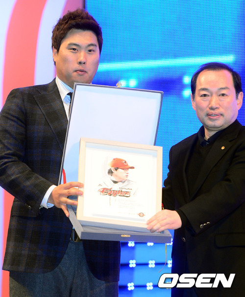 5일 오후 대전 한밭 종합운동장 내 한밭 체육관에서 진행된 '류현진 MLB 진출 기념 환송회'에서 류현진이 한화 이글스 정승진 대표이사로부터 감사패를 건네받고 있다.