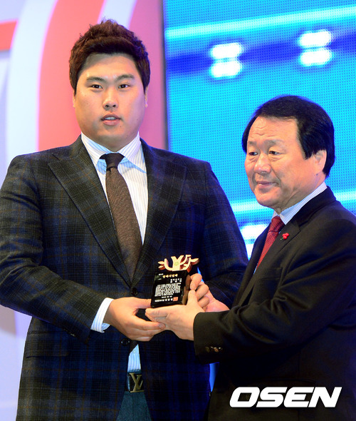 5일 오후 대전 한밭 종합운동장 내 한밭 체육관에서 진행된 '류현진 MLB 진출 기념 환송회'에서 류현진이 염홍철 대전시장으로부터 명예 시민패를 건네받고 있다.