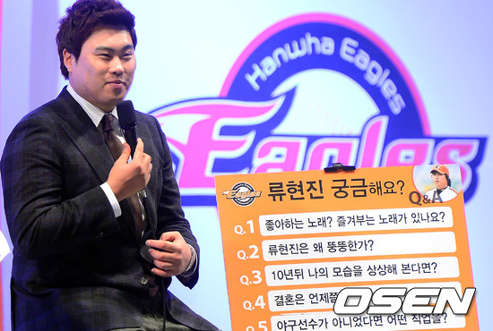 5일 오후 대전 한밭 종합운동장 내 한밭 체육관에서 진행된 '류현진 MLB 진출 기념 환송회'에서 류현진이 질문에 답변을 하고 있다.