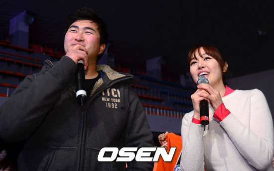 5일 오후 대전 한밭 종합운동장 내 한밭 체육관에서 진행된 '류현진 MLB 진출 기념 환송회'에서 한화 안승민과 김민아 아나운서가 류현진에게 질문을 하고 있다.