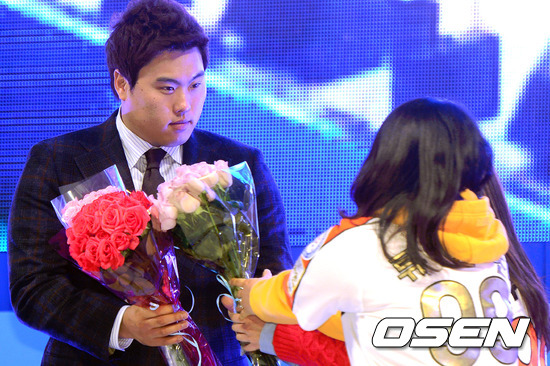 5일 오후 대전 한밭 종합운동장 내 한밭 체육관에서 진행된 '류현진 MLB 진출 기념 환송회'에서 류현진이 팬들에게 꽃다발을 건네받고 있다.
