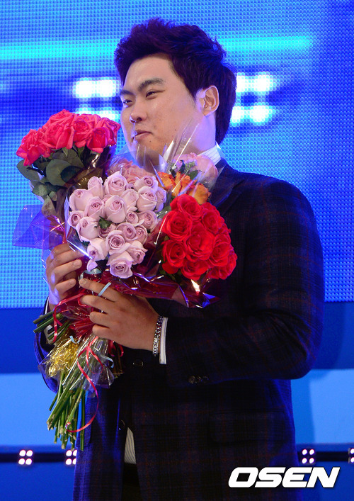 5일 오후 대전 한밭 종합운동장 내 한밭 체육관에서 진행된 '류현진 MLB 진출 기념 환송회'에서 류현진이 팬들로부터 전달받은 꽃다발을 들고 있다.