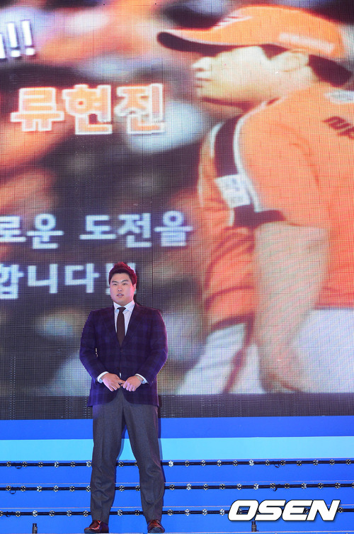 5일 오후 대전 한밭 종합운동장 내 한밭 체육관에서 진행된 '류현진 MLB 진출 기념 환송회'를 마친 뒤 류현진이 포토타임을 갖고 있다.