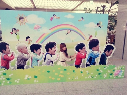 공개된 사진에는 '무한도전‘ 멤버들의 실제크기 판넬 중간에서 환한 미소로 카메라를 응시하고 있는 주니엘의 모습이 담겨 있다. 특히 머리만 크게 표현된 ’무한도전‘ 멤버들의 사진과 주니엘의 천진난만한 모습이 서로 어우러져 웃음을 자아낸다.