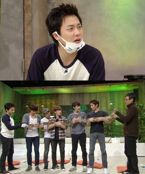 파충류 공포증을 가지고 있는 그룹 신화 멤버 앤디가 뱀 등장에 기겁했다.