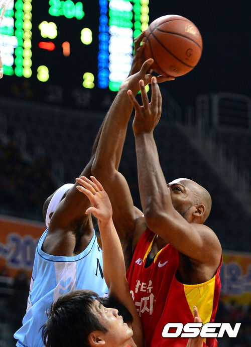 6일 오후 경기 고양체육관에서 열린 'KB 국민카드 2012-2013 프로농구' 고양 오리온스와 울산 모비스의 경기, 1쿼터 오리온스 윌리엄스가 모비스 문태영의 슛블록에 당하고 있다.