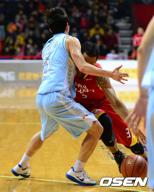6일 오후 경기 고양체육관에서 열린 'KB 국민카드 2012-2013 프로농구' 고양 오리온스와 울산 모비스의 경기, 2쿼터 오리온스 전태풍이 모비스 김시래와 충돌하고 있다.