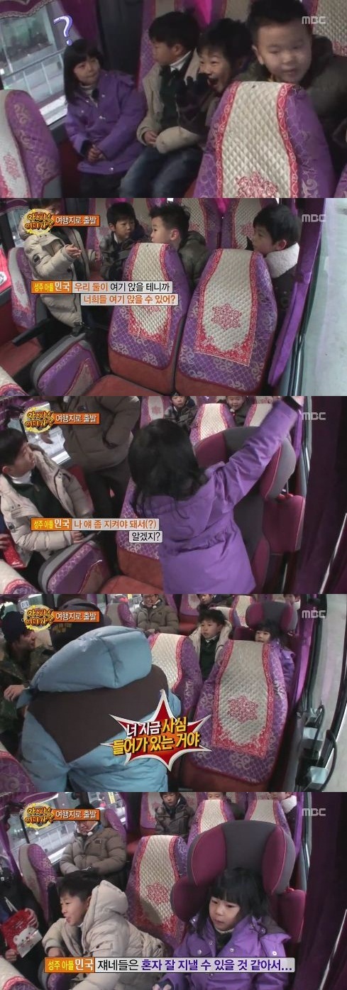 아빠들과 아이들은 품걸리로 가기 위해 버스를 탔다. 버스 맨 뒷자리에 아이들이 자리 잡은 가운데 민국과 지아가 서로 눈을 마주더니 지아가 앞자리로 옮기자 민국이 지아를 따라서 옆자리에 앉았다.