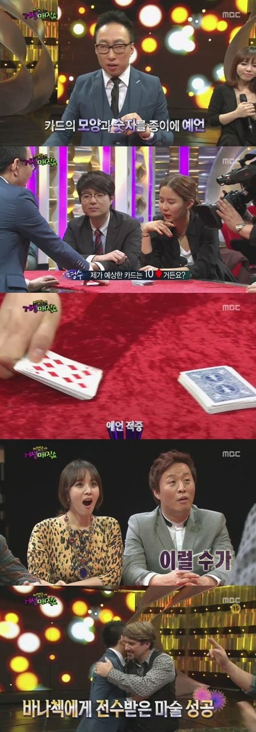 박명수는 직접 세계적인 마술 거장과 함께 선보이는 코너인 '비법 공개 거성 매직쇼'에서 마술사 바나첵이 출연진을 깜짝 놀라게 한 카드 예언 마술을 시도했다.