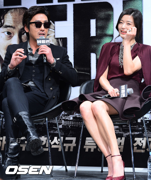 7일 오전 서울시 강남구 압구정 CGV에서 열린 영화 '베를린' 제작보고회에서 하정우의 말에 전지현이 웃고 있다.