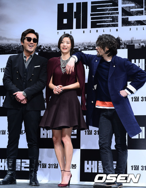 7일 오전 서울시 강남구 압구정 CGV에서 열린 영화 '베를린' 제작보고회에서 하정우 전지현 류승범이 포토타임을 갖고 있다.