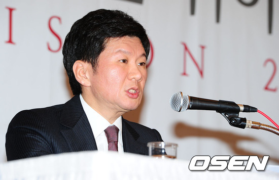 7일 오후 서울 홍은동 그랜드힐튼 호텔에서 열린 대한축구협회장 출마 기자회견에서 정몽규 전 총재가 출마소감을 말하고 있다