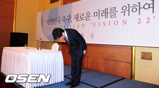 정몽규 총재는 기자회견에 앞서 이날 오전 한국프로축구연맹 임시 이사회 및 임시 총회에서 총재직 사퇴 의사를 밝히고 축구협회장 선거에 나섰다.