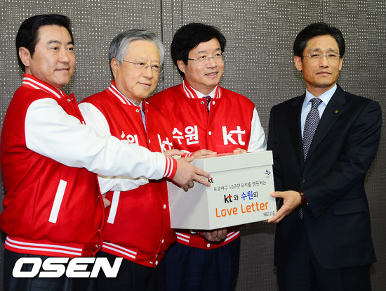 이재율 경기도 경제 부지사와 KT 이석채 회장, 수원 염태영 시장이 KBO 양해영 사무총장에게 유치 신청서를 제출하고 있다.