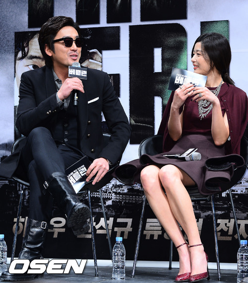 7일 오전 서울시 강남구 압구정 CGV에서 열린 영화 '베를린' 제작보고회에서 전지현이 하정우를 바라보고 있다.