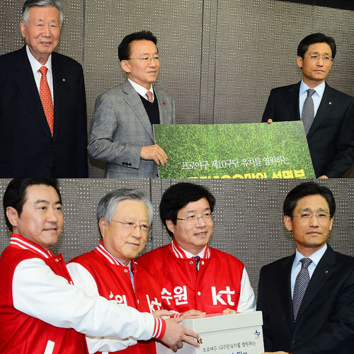 이어 야구회관에 모습을 드러낸 이석채 KT 회장은 “KT 상품을 좋아하는 국민만 3000만 명이 있다. 우리나라 굴지의 기업이고 직원만 6만 명이 넘는다. IT를 접목시켜 야구장 설계에 독자적인 생각을 갖고 야구 선수들의 기량뿐이 아닌 관중에게 즐거움을 선사해 새 역사를 써 나가겠다”고 포부를 밝혔다. 염태영 수원시장도 “수원시는 2년 전부터 프로야구 10구단을 유치하기 위해 모든 준비를 해왔다”며 당위성을 역설했다.