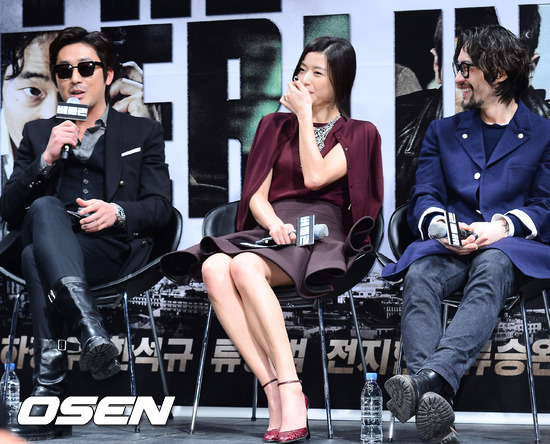 7일 오전 서울시 강남구 압구정 CGV에서 열린 영화 '베를린' 제작보고회에서 하정우의 말에 전지현과 류승범이 웃고 있다.