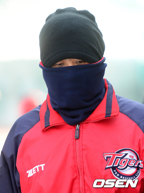 8일 오전 광주 무등구장에서 열린 KIA 타이거즈의 훈련에서 김상훈이 넥워머를 눈 밑까지 올린 채 훈련에 임하고 있다.
