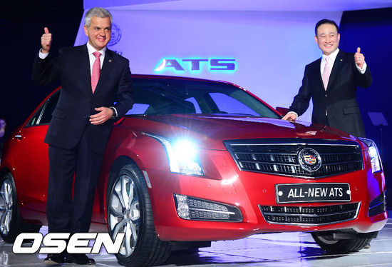 8일 오전 서울 용산구 그랜드 하얏트 호텔서 열린 캐딜락의 컴팩트 럭셔리 스포츠 세단 캐딜락 ‘ATS’ 신차 발표회에서 한국 GM 세르지오 호샤 대표와 장재준 GM코리아 대표가 포토타임을 갖고있다.