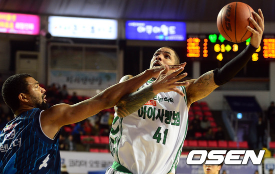 8일 오후 전주 실내체육관에서 열린 'KB 국민카드 2012-2013 프로농구' 전주 KCC와 원주 동부의 경기 3쿼터 센슬리가 알렉산더를 피해 슛을 시도하고 있다.