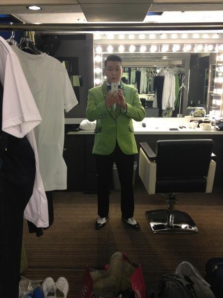 공개된 사진 속 싸이는 ‘강남스타일’ 무대 의상을 입고 분장실에서 거울을 보며 휴대폰 카메라로 자신의 모습을 찍고 있다. 특히 이 모습에서 싸이는 과거보다 전체적으로 날씬해진 몸매와 볼살 실종 모습을 보여줘 눈길을 끈다.