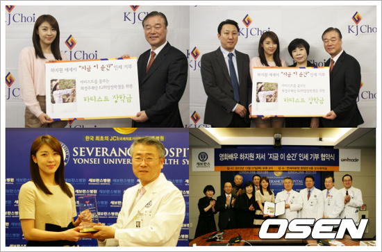 하지원 소속사는 9일 “하지원은 지난해 10월 출간한 첫 에세이집 ‘지금 이 순간’의 인세 전액을 ‘꿈을 꾸는 친구들’에게 기부하겠다는 의사를 밝혔다”며 “지난달 27일 최경주 재단과 연세대학교 의료원에 각각 인세 50%씩을 기부한다는 기부 협약을 체결했다”고 전했다.