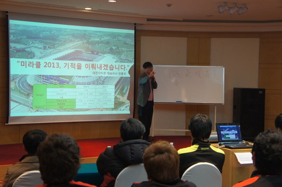 현재 제주 서귀포에서 전지훈련 중인 대전시티즌 선수단은 8일 오후 한웅수 전 FC서울 전무를 초청해 강연을 듣는 시간을 가졌다. 한 전무는 30여 년 동안 프로축구 일선에서 활약하며 선수단 주무를 시작으로 운영과장, 사무국장, 단장까지 오른 입지전적인 인물이다. 이날 강연에서 한 전무는 실제 현장에서 체험하고 느낀 바를 바탕으로 선수들에게 실질적으로 도움이 되는 이야기들을 풀어놓으며 박수갈채를 받았다.