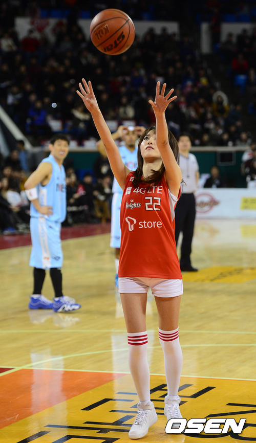 9일 오후 서울 잠실학생체육관에서 열린 'KB 국민카드 2012-2013 프로농구' 서울 SK와 울산 모비스의 경기 시작 전 장유례 아나운서가 시투를 하고 있다.