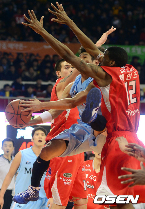 9일 오후 서울 잠실학생체육관에서 열린 'KB 국민카드 2012-2013 프로농구' 서울 SK와 울산 모비스의 경기 3쿼터 양동근이 SK 수비들을 뚫고 슛을 시도하고 있다.