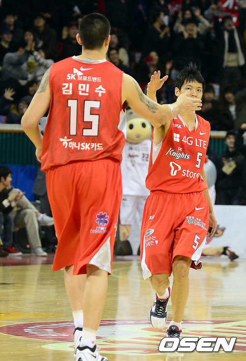 9일 오후 서울 잠실학생체육관에서 열린 'KB 국민카드 2012-2013 프로농구' 서울 SK와 울산 모비스의 경기 3쿼터 김민수가 외곽슛을 성공 시킨 후 김선형과 하이파이브를 하고 있다.