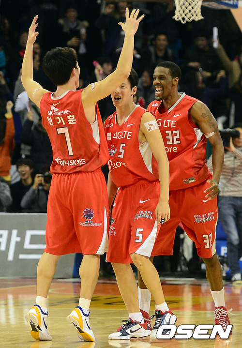 9일 오후 서울 잠실학생체육관에서 열린 'KB 국민카드 2012-2013 프로농구' 서울 SK와 울산 모비스의 경기 종료 후 역전 3점포를 넣은 변기훈이 동료들과 기뻐하고 있다.