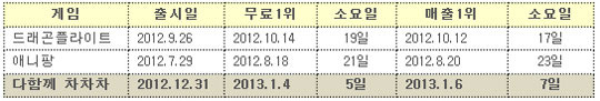 지난해 스마트폰 국민게임의 자리를 차지했던 ‘드래곤플라이트’와 ‘애니팡’의 경우도 구글플레이 인기무료 1위는 출시일로부터 각각 19일, 21일 정도 소요됐고, 최고 매출 1위도 각각 17일과 23일이 걸렸다. 이에 비해 '차차차'는 ‘카카오 게임하기’ 출시게임 중 최단 기간인 각 각 5일과 7일만에 이뤄내 더욱 주목받고 있다.