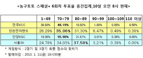 [농구토토] 국민체육진흥공단(www.kspo.or.kr)이 발행하는 체육진흥투표권 수탁사업자인 스포츠토토 공식 온라인 발매 사이트인 베트맨(www.betman.co.kr)은 11일에 펼쳐지는 KCC-전자랜드(1경기), KGC-SK(2경기)전 등 한국프로농구(KBL) 2경기를 대상으로 한 농구토토 스페셜+ 6회차 투표율 중간집계 결과, 안양KGC-서울SK(2경기)전에서 선두 서울SK의 우세를 내다봤다.