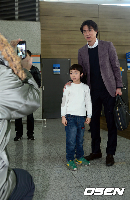 출국에 앞서 홍명보 감독이 어린아이와 기념촬영을 하고 있다.