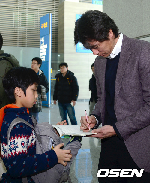출국에 앞서 홍명보 감독이 어린아이에게 사인을 해주고 있다.