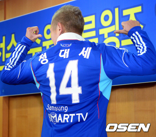 정대세가 10일 오후 서울 신문로 축구회관에서 열린 수원 입단 기자회견에서 카메라를 향해 등번호를 보이고 있다.