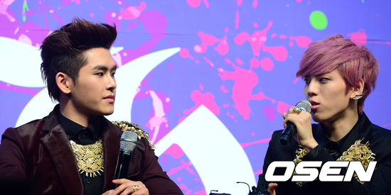 10일 오후 서울 광장동 유니클로 악스홀에서 열린 그룹 인피니트H 쇼케이스에서 인피니트 H 호야와 동우가 취재진의 질문에 답을 하고 있다.