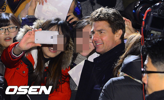 톰 크루즈가 팬들과 셀카를 찍고 있다.