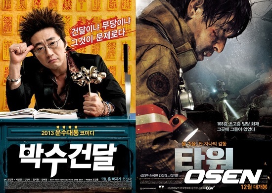 밤엔 건달, 낮엔 무당으로 분한 박신양표 코믹물 ‘박수건달’은 웃음을, 화재와 맞서 살아남기 위해 고군분투하는 사람들의 얘기를 그린 ‘타워’는 감동을 선사, 두 영화가 서로 각기 다른 매력을 가지고 있어 관객들이 어떤 영화를 선택할지 관심이 모아지고 있다.