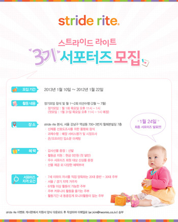 아동화 전문 브랜드 스트라이드 라이트는 브랜드 홍보와 제품 선호도 조사를 위한 3기 서포터스를 10일부터 22일까지 모집한다고 밝혔다.
