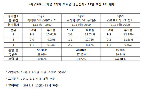 EPL 3경기 대상 축구토토 스페셜 3회차 투표율 중간집계 결과