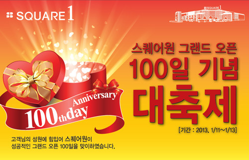 복합쇼핑몰 스퀘어원(SQUARE 1)이 11일부터 13일까지 3일간 오픈 100일을 맞아 인기가수 초청 공연, 경품 증정 행사 등 다양한 이벤트를 펼친다.